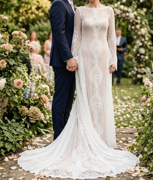 Ethereal Bohemian Long-Sleeve Lace Gown with Medallion Motif