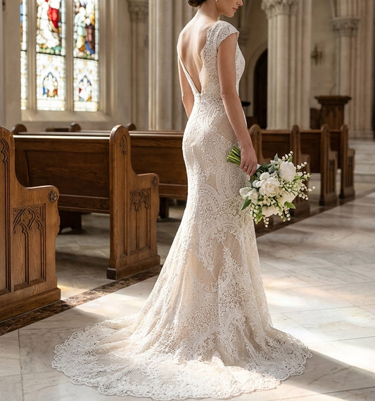 Enchanting All-Over Lace Trumpet Gown with Scalloped V-Neck